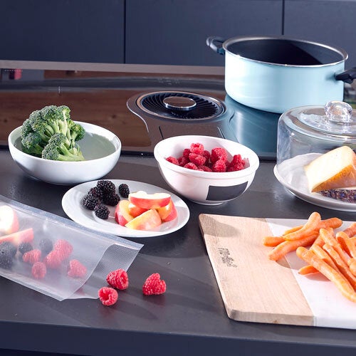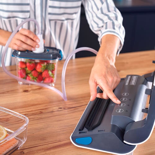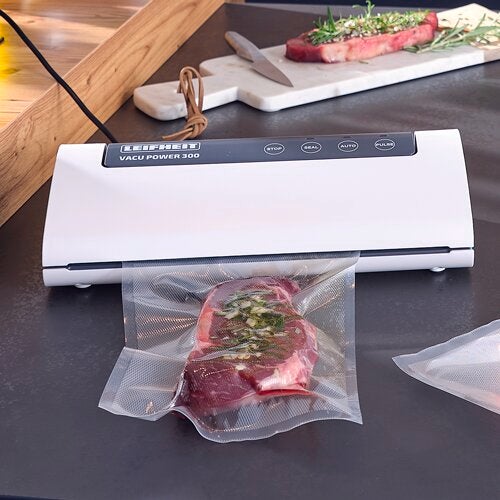 La envasadora al vacío de Leifheit no solo conserva al vacío y herméticamente casi todos los alimentos, sino que también tiene una bomba de vacío con una potencia de nueve litros por minuto. Además, la intensidad del vacío se puede regular individualmente y, por eso, la envasadora no debería faltar en ninguna cocina.